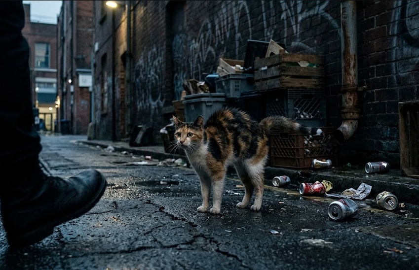 The evening air was thick with the scent of rain and wet asphalt as the man swaggered down the narrow alleyway, his boots clicking sharply against the pavement. He was looking for a distraction, something to exert his perceived power over, when he spotted a scrawny calico cat huddled near a stack of discarded crates. Without a second thought, he pulled back his foot and sent a rusted soda can flying toward the creature. The metal clattered harshly against the ground, and the man let out a sharp, jagged laugh as the cat jumped back, its fur bristling in fear. “Pathetic,” he muttered, his chest swelling with a misplaced sense of superiority. He took another predatory step forward, expecting the animal to bolt into the shadows.