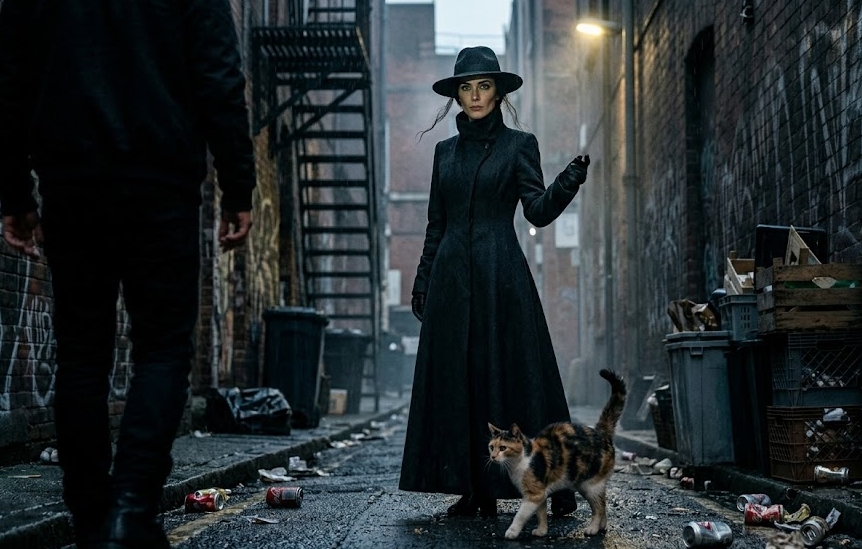 The woman stepped forward into the light, and the man saw that she wasn’t looking at him with anger, but with a profound, chilling pity. It was the look one gives a child about to walk off a ledge. Under her gaze, the man felt his stature shrink. The alleyway, which he had treated as his personal stage, now felt like a cage where the bars were made of silence. He looked back at the cat, which was still staring, its tail twitching once in a slow, rhythmic motion that felt like a countdown. The power dynamic had flipped so violently that the man felt dizzy. He slowly lowered his foot, his boots making a dull, defeated sound on the pavement.