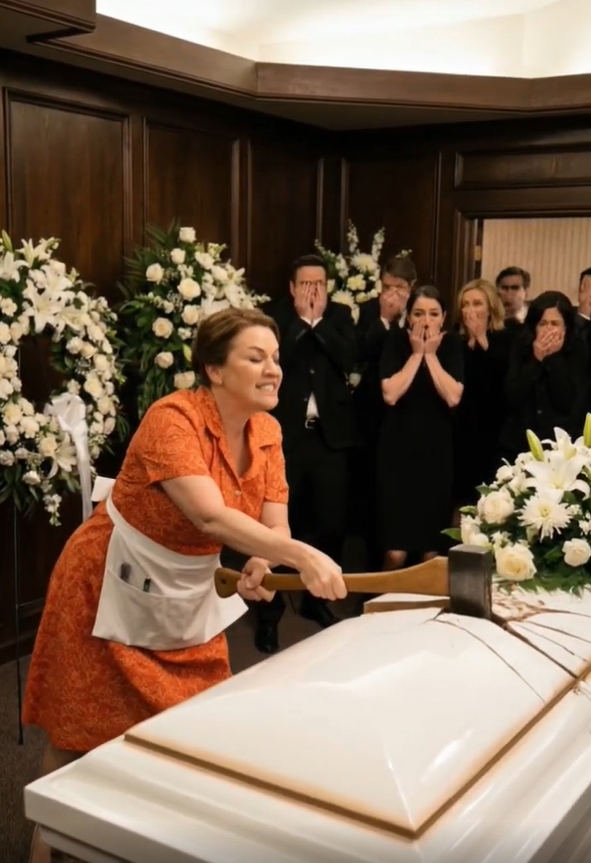 The first blow landed with a sickening crack, splintering the lacquered surface of the lid. Gasps of horror rippled through the room as guests rose from their seats, frozen in a mix of shock and indignation. The woman didn’t stop, her breath coming in ragged gasps as she swung again and again, shouting that he wasn’t gone, that they were burying him alive. To the onlookers, it was a psychotic break fueled by grief, a desecration of the most sacred moment of parting.