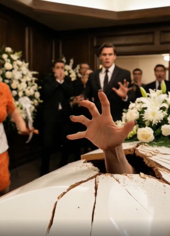 A collective shriek tore through the parlor as the realization dawned on the crowd. This was no miracle of survival. The hand gripped the lid, and with a violent heave, the remaining wood shattered completely. The figure within sat bolt upright, its movements jerky and unnatural, its milky eyes fixed on nothing. The woman in the orange dress backed away, her triumph instantly curdling into a primal, paralyzing fear. She had wanted him back, but the thing that climbed out of the casket was a hollow echo of the man she loved, a vessel for a hunger that didn’t belong in the world of the living.