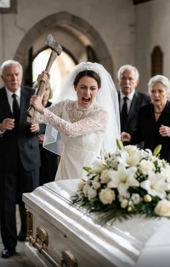 She ignored the gasps of horror and the frantic shouts of the funeral director, who tried in vain to pull her away. With every strike, she shrieked that Elias was still breathing, her eyes wide with a desperate, frantic certainty. The wood splintered under her assault, sending shards of white lacquer flying into the faces of the front-row mourners. As the lid finally buckled, she dropped the axe and leaned into the jagged gap, her ear pressed against the dark velvet interior. “He’s in there!” she wailed, her voice cracking against the wind. “I can hear him! He’s fighting!” The crowd surged forward, torn between the impulse to tackle her and the sudden, chilling fear that her madness might contain a grain of impossible truth.