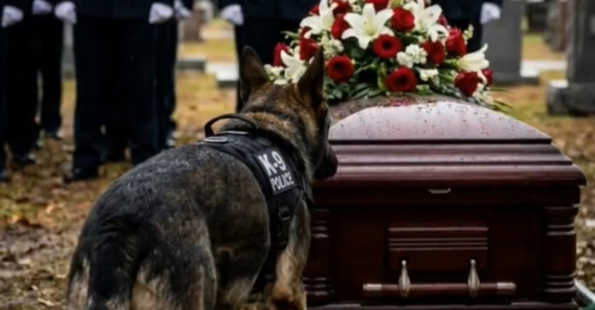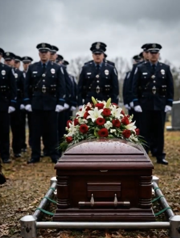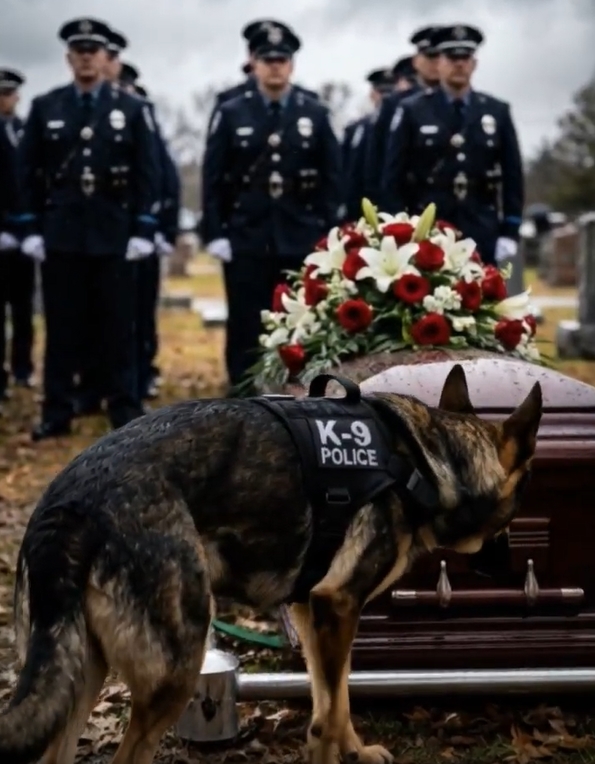 The morning mist clung to the grass of the cemetery, mirroring the heavy hearts of the hundreds gathered in a sea of navy blue. They stood in perfect, rigid formation—a testament to a life defined by discipline, service, and sacrifice. The air was thick with the scent of lilies and the sharp, metallic tang of a cold spring morning. At the center of this somber assembly sat a polished wooden casket, draped in a flag that fluttered slightly in the breeze. For the officers standing at attention, the silence was a wall of respect, but for the one four-legged mourner at the front, the silence was a void that couldn’t be filled.