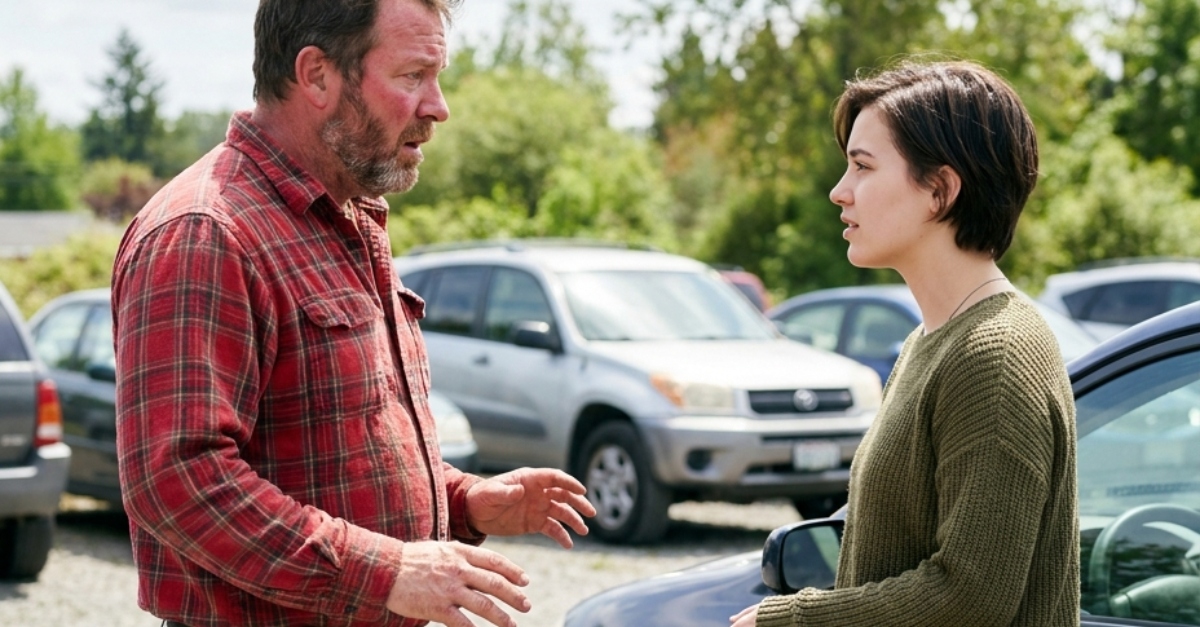 The afternoon sun glared off the polished chrome of the suburban shopping center, but the atmosphere in Row C was anything but bright. A man stood over a compact sedan, his face flushed with a crimson heat that had nothing to do with the weather. He lashed out, his heavy boot connecting with the front tire of the car with a dull thud. “You’re practically on top of me!” he roared, gesturing wildly at the narrow gap between their vehicles. He was looming, his shadow stretching over the driver’s side door like a threat, demanding she move her “piece of junk” before he lost his temper completely.