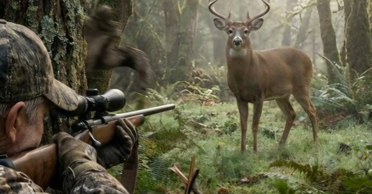 The forest was held in a fragile, icy silence that seemed to amplify every heartbeat. Elias had been tracking the buck for three days, moving through the dense underbrush with the patience of a man who had nothing but time. Now, in the center of the clearing, his prize stood perfectly still. The deer was a magnificent creature, its antlers branching out like the gnarled limbs of an ancient oak, but it wasn’t acting like prey. It didn’t sniff the wind or flick its ears in alarm. Instead, it stared with an eerie, glass-like intensity at a point just over Elias’s shoulder, as if the hunter wasn’t there at all.