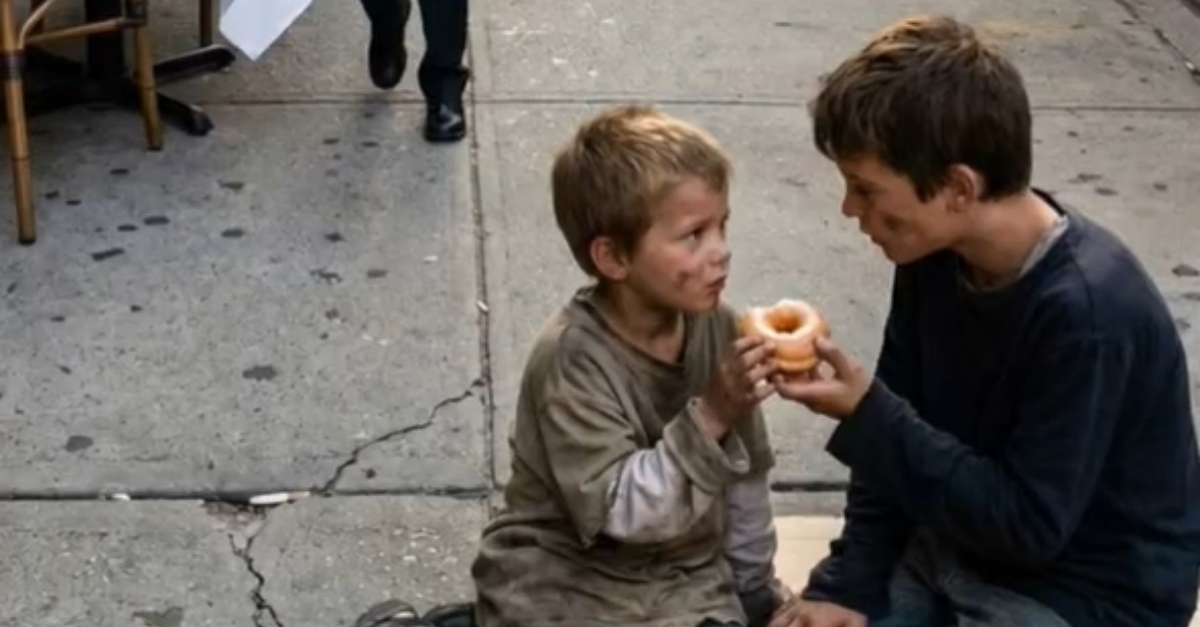 Across the narrow asphalt divide, the air felt sharper and the light dimmer. Leaning against a graffiti-stained brick wall, another boy of the same age sat on a flattened cardboard box. His clothes were thin, worn to threads at the elbows and knees, but his attention was entirely captured by a singular, grease-stained paper bag. With dirt-smudged fingers, he carefully pulled out a single glazed donut. It was slightly crushed, likely a day-old discard from a nearby bakery, but to him, it was a feast. He broke it in half with practiced precision, savoring the sugary scent before taking a small, deliberate bite.