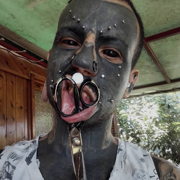 At just 27, Niccolò Saverino from Aprilia, Italy, doesn’t look like anyone else — and that’s exactly how he wants it. Over the course of a decade, he’s turned his body into a living canvas. Nearly 70% of his skin is covered in tattoos, his tongue is split in two, and small subdermal implants rise beneath his skin like horns. His ears and face are decorated with piercings and gauges, each one part of the art he carries with him every day.