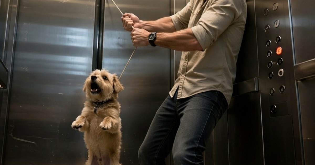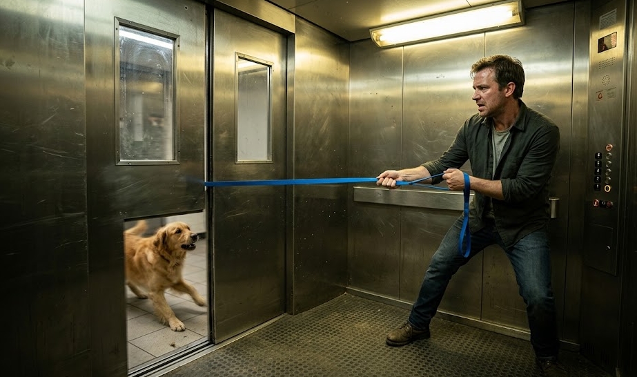 The floor shifted beneath him, a sickening lurch that signaled the elevator’s safety sensors were finally reacting to the strain. Brian felt a moment of weightlessness as the cabin shuddered to a violent halt between floors. The lights gave one final, dying flicker before the emergency reds kicked in, bathing the scene in a dull, crimson glow. He didn’t let go. He could feel the weight of the dog on the other side, the leash still dangerously tight. With a final, desperate heave, Brian wedged his shoulder against the door frame and yanked the rope upward, hoping to find enough slack to unhook the loop from the mechanism.