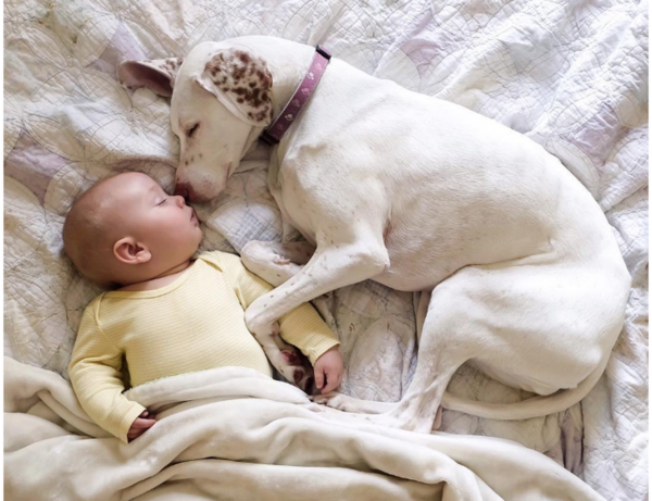 He simply inhaled the baby’s scent, whimpered softly, and lay down at their feet.