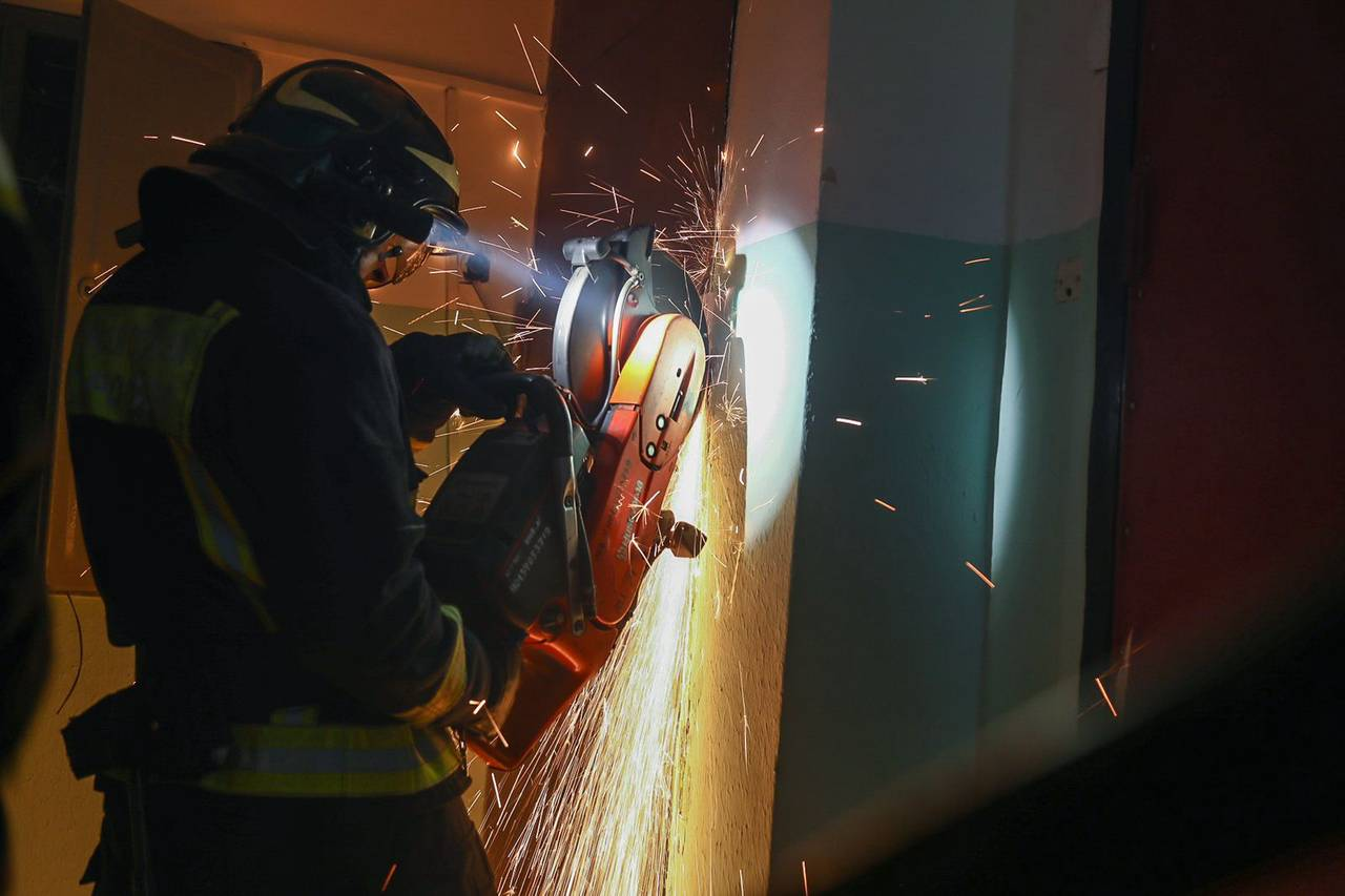 The elevator doors were jammed tight. One firefighter shone a light while another wedged a crowbar into the crack; a third prepared the safety gear. The metal groaned, sparks flew.